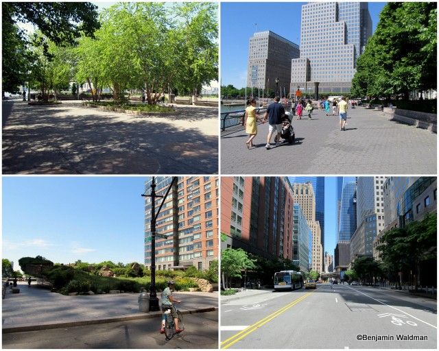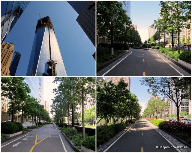 Continuing along West Street, passing in the shadow of the Freedom Tower, the Greenway is well developed, providing separate paths for bikes and pedestrians.