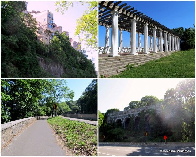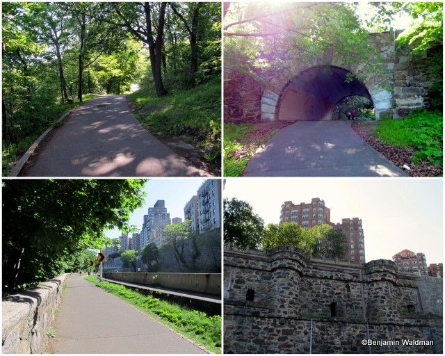 After a short span as a bucolic path, the Greenway exits the park through a tunnel and ends up (almost) at grade with the Henry Hudson Parkway. This section of the path does not provide much room for cyclists and pedestrians to share. One of the noteworthy sites along this expanse of the Castle Village’s retaining wall which is left over from Dr. Charles V. Paterno’s, Paterno Castle.