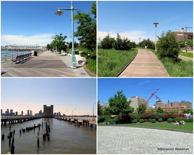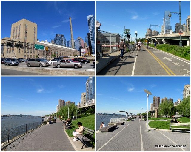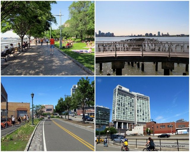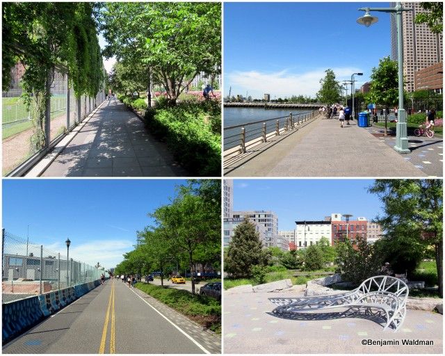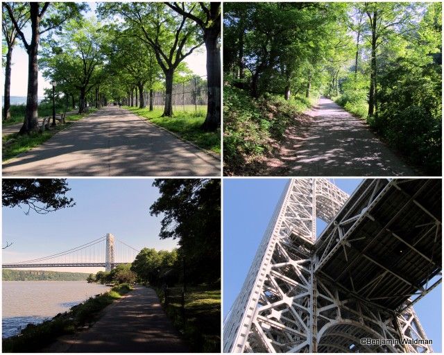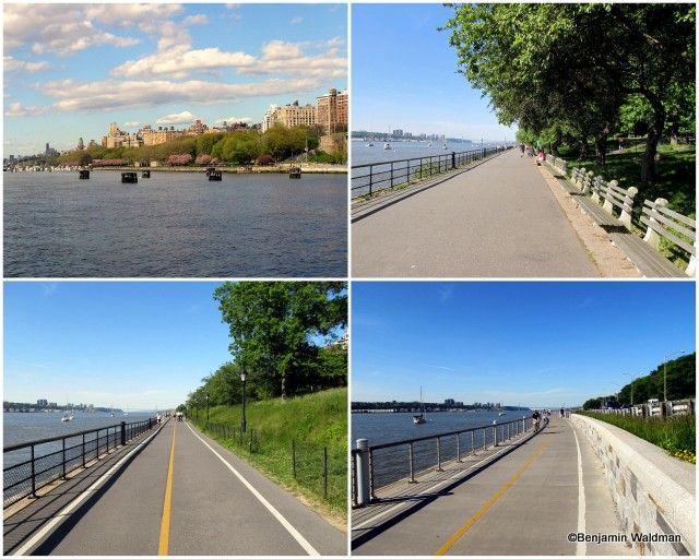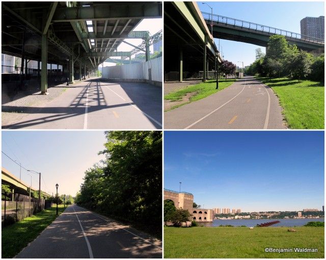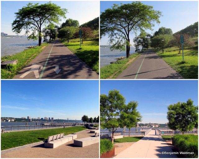 This section of the Greenway is well landscaped and paved. It is bounded (without a barrier) by the Hudson River to the West and the Henry Hudson Parkway to the East. The path is demarcated for walkers/joggers and cyclists. This part of the path is well populated with people running, biking, walking their dogs and even fishing. The two lower, and upper right, photos showcase the West Harlem Piers Park. The park is well landscaped, contains benches and sculptures, and has access into the Hudson River via its piers.