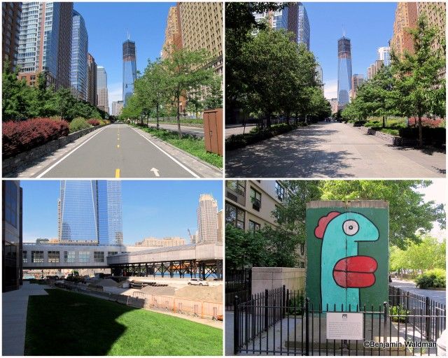 While it does not abut the waterfront, the West Street segment of the Greenway begins one of the widest and most well landscaped portions of the Greenway. The upper left photo shows the bike path and the upper right photo shows the adjoining pedestrian path. Part of this section of the Greenway is still under construction and necessitates a detour through Battery Park City. As you enter Battery Park City, you pass a piece of the Berlin Wall (another section can be found in Midtown).