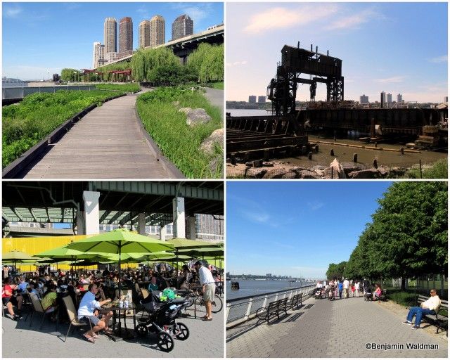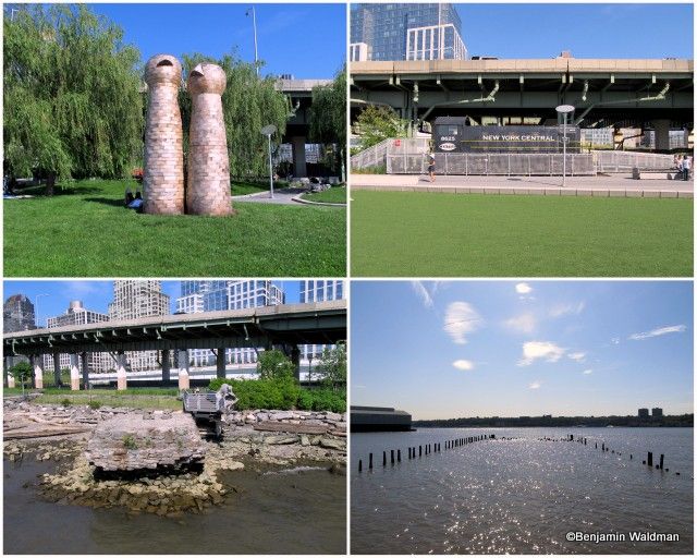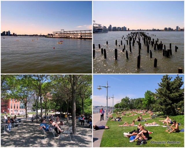 Numerous people were taking advantage of the free kayacking available in the Hudson River as well as using the numerous tables, chairs, and lawns to relax. The remnants of former piers dot the Hudson River.