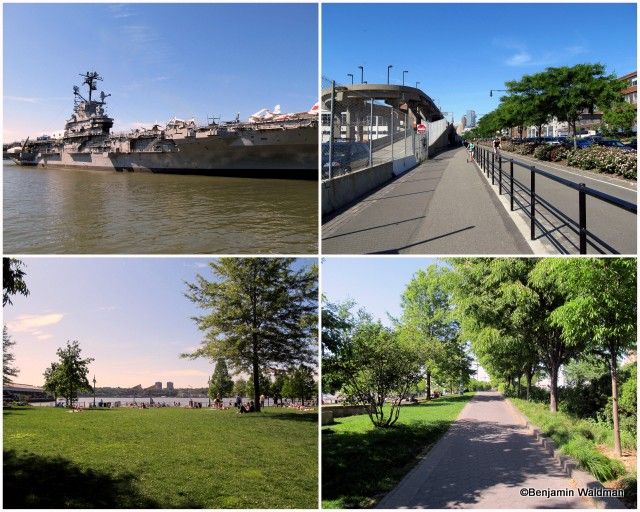 By the Intrepid at 46th Street, which is only one of Hudson River Park’s historic ships, the path once again becomes a simple asphalt path for a short period until the pedestrian path is once again surrounded by lawns and trees.
