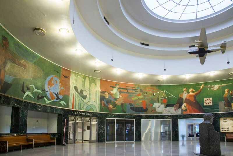 It may take many visits to make the connection that yes, once airplanes did land by sea – hence, the Marine Air Terminal at LaGuardia Airport. With a clear architectural connection to the Works Progress Administration, the murals were once covered over because of their supposed connection to Communist propaganda. The circular terminal is a wonderful step back in time, like a visit to the TWA Flight Center (also an interior landmark), and today it is the “only active air terminal dating to the first generation of air travel,” state Gura and Wood in Interior Landmarks: Treasures of New York.