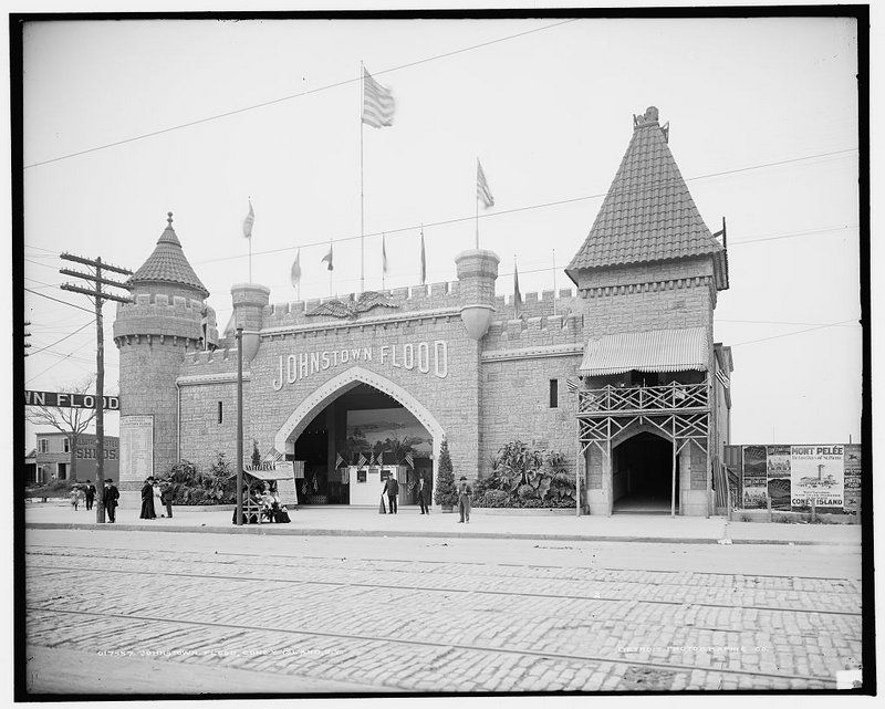 Coney Island also showed simulations of real tragic disasters for audiences to watch. One popular reenactment was the 1902 Galveston Flood in a large building on Surf Avenue and 17th street. Workers used real and fake water, large amounts of cotton, and lighting and mechanical effects to simulate the real flood, which killed about 6,000 people in 1900. Other natural disaster reenactments were those of the San Francisco Earthquake, the Johnstown Flood, and the eruption of Mount Pelee.