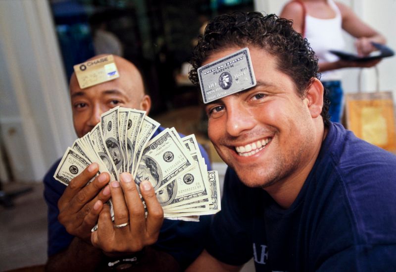 Film director and producer Brett Ratner (right), 29, and Russell Simmons, 41, a businessman and cofounder of hip-hop label Def Jam, at L’Iguane restaurant, St. Barts, 1998. Few establishments on the island accepted credit cards, and visitors often carried large amounts of cash. Photo courtesy of ICP.