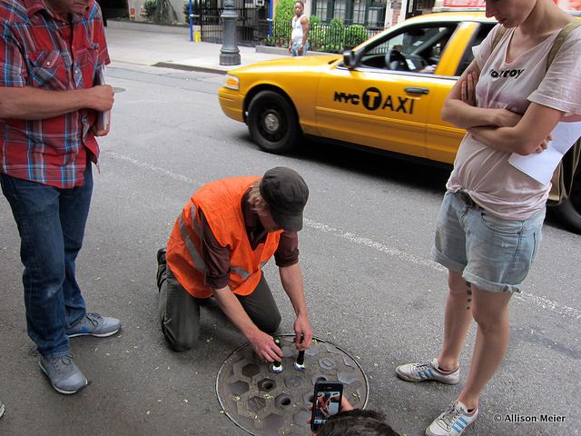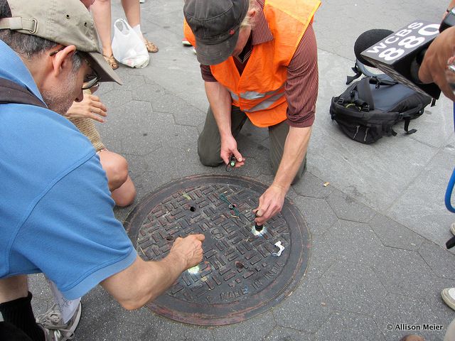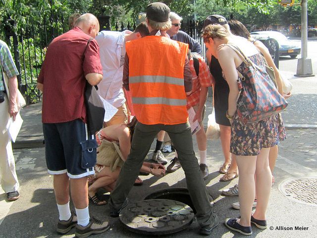 thstreet. Getting on his knees, he pulled flashlights and tiny telescopes out of his bag and urged us to join him on the ground to peer through the tiny holes in the cover. I’ll admit, I wasn’t one of the takers. I kept my spot, standing tall on two feet while the others, mostly the men, kneeled down to look. Steve grinned, “That’s it? No one else?” Then with a laugh, he took out a hook like contraption and pulled the grate up and out and, with a refreshing moment of joking, said he always liked to see how many people he could get on the ground.