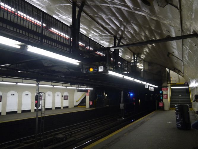 Located directly under a hill and 8 to 10 stories below surface level, the 181st Street station is one of the deepest in the system (191st Street is reportedly the deepest thus far). It has an impressive design, including a wonderful little Art Deco entrance (across from Bennett Park). Below ground, the subway station has an elegant hanging mezzanine that is just above the subway tracks.