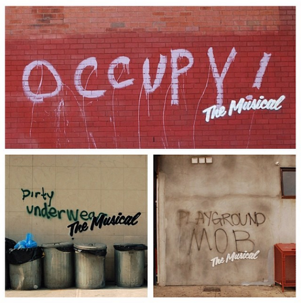 “Occupy! The Musical” was located in Bushwick, Brooklyn before it was taken down. There were two other “The Musical” locations: Dirty Underwear and Playground Mob. Al three were found pieces of graffiti, onto which Banksy added “The Musical” to.