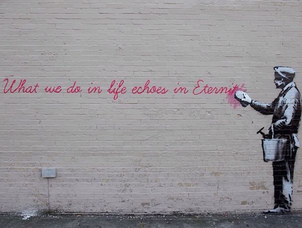 Located on 68th Street and 38th Avenue in Queens, just off the 7 Train, the text reads “What we do in life echoes in Eternity,” as a man begins to wipe it off the wall. The quote is from Maximus in Gladiator, which is a variation from the original by Marcus Aurelius, the Roman emperor and philosopher who said “What we do now echoes in eternity.”