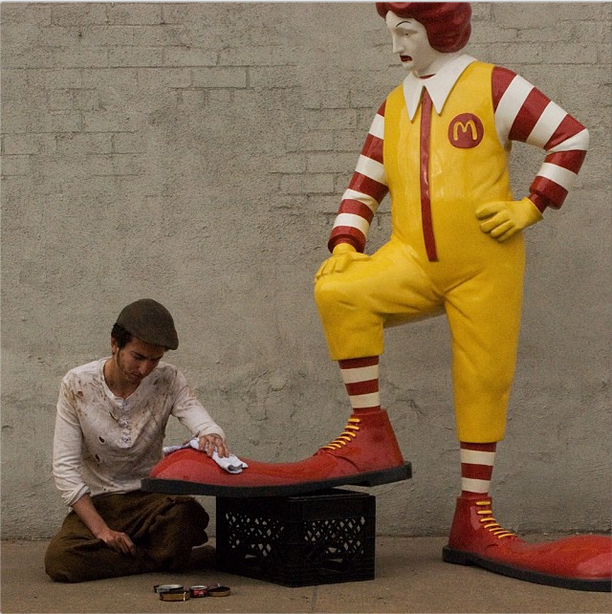 Banksy created a fiberglass replica of a Ronald McDonald having his shoes shined by a real person outside a McDonald’s in the South Bronx. The sculpture (plus the actor) traveled to a different McDonalds at lunchtime for the next week.