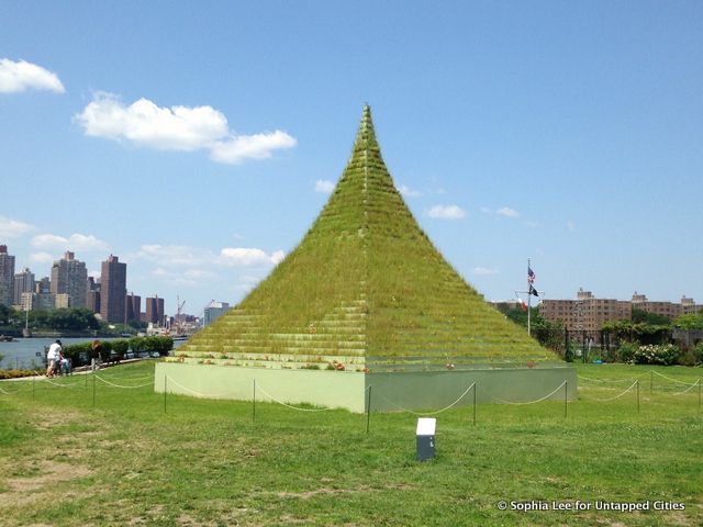 Overlooking the East River from Long Island City is a thirty-foot high pyramid of planted grasses – the Socrates Sculpture Park’s latest installation, The Living Pyramid. The pyramid, which is the creation of local artist Agnes Denes, is thirty feet at its four-sided base and consists of several tons of soil holding the greens. This site specific installation will be up through August 30th. We look forward to the changing faces of this installation all along the way.