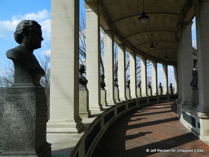 The Bronx Community College Hall of Fame for Great Americans is located at the rear of the Gould Memorial Library overlooking the view. It was built to honor famous people who were accomplished in 15 fields, including business, theology, music, medicine, law and inventing. Any American or American organization could nominate a hall of fame candidate for consideration, but nominees had to fit specific criteria. To be eligible, nominees had to be native-born American citizens or have naturalized since 1914. In addition, nominees also had to have been dead for 25 years, a rule put in place since 1922. Before, nominees only had to be dead 10 years. Notable individuals in the hall of fame are Abraham Lincoln, Susan B. Anthony, Alexander Graham Bell, Alexander Hamilton, John Philip Sousa and the Wright Brothers.