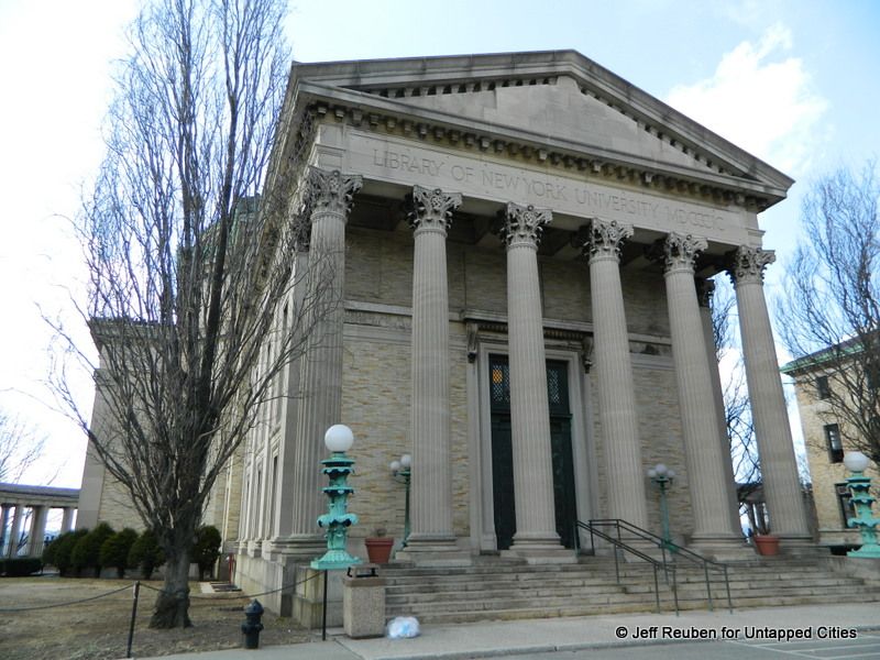 In 1904, Stanford White of the famous McKim, Mead and White, was hired to create buildings on the former New York University Campus. He was responsible for a number of buildings around the campus, including the Hall of Languages, the Cornelius Baker Hall of of Philosophy and the Gould Memorial Library, pictured above. The buildings were sponsored by wealthy patrons: Mrs. John Steward Kennedy funded the hall of philosophy in memory of her father, while the Gould Memorial Library was sponsored by Helen Miller Shepherd, wife of millionaire Jay Gould. White was involved in other notable projects around the city, including Madison Square Garden and the Washington Square Arch.