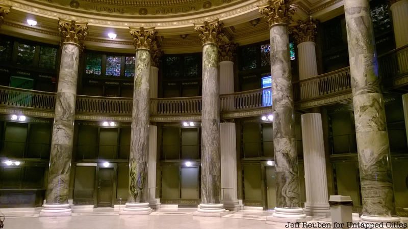The domed Gould Memorial Library was designed as the centerpiece of the Bronx Community College. An anarchist bombed the space with a molotov cocktail in 1969, and the blast destroyed part of the Tiffany glass skylight, the stage, an organ, and many of the wooden seats.