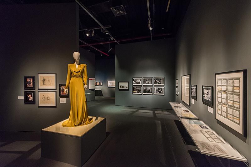 In the foreground, a costume designed by Sandy Powell and worn by Cate Blanchett as Katharine Hepburn in The Aviator (2004). Photo: Thanassi Karageorgiou/Museum of the Moving Image.
