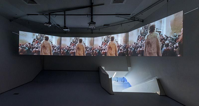 A view of the video installation (13 mins) created by curator Nils Warnecke, in the Museum’s video screening amphitheater (on screen: scene from The Last Temptation of Christ (1988). Photo: Thanassi Karageorgiou/Museum of the Moving Image.