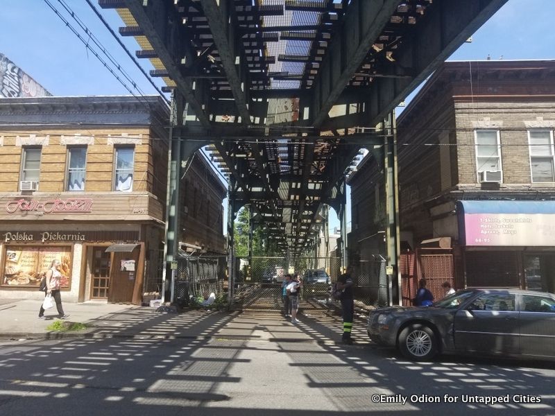 Walking under the raised M line is perhaps the most representative street walking experience for the neighborhood. Here in Ridgewood, the street under the train mellows out and provides a shady and more relaxing walking experience than its counterpart farther West in Bushwick. Many great and long standing establishments line the street, including Jorge’s restaurant and many crown fried chicken places. Entering any of the M line subway platforms allows for a wide and mostly unobstructed view of the Manhattan skyline. Walking along under the train is a great introduction to the neighborhood.