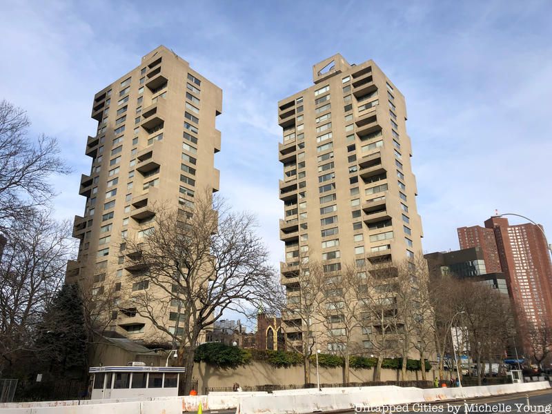 Owen lives in an apartment on Roosevelt Island along Main Street, which has a collection of Brutalist ’70s architecture. Specifically he lives in an apartment complex known as Eastwood, designed by Sert, Jackson & Associates. It was developed as a Mitchell-Lama housing development aimed at lower and middle income families. The Queensboro Bridge and the Roosevelt Island apartment buildings are plastered with large neon advertisements.
