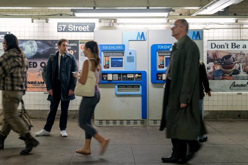 To get to work, Owen heads into the New York City subway system run by the New York City Transit Authority, the entity before the current Metropolitan Transit Authority (MTA). He tries to pay at the retro looking vending machines (added for the set) at the 57th Street N/Q/R/Q line but by the time he gets underground, having enlisted the help of AdBuddy to pay for his fare, he’s shown to be at the 2nd Avenue subway station.