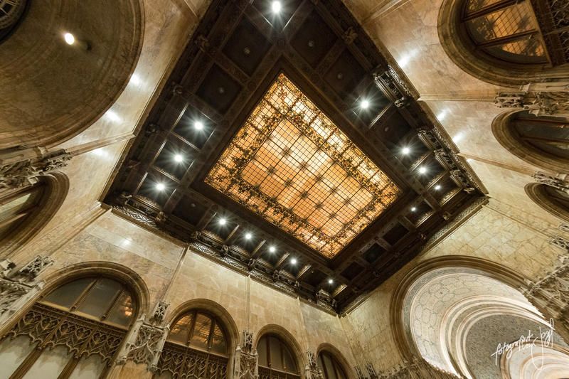 The glittering effect of the ceiling is due to up-lighting hidden within the “lace-like marble cornice at the springing of the arches.” In the galleries at the northern and southern ends of the arcade’s cross-sections are two murals that depict the allegorical figures of “Commerce” and “Labor,” reinforcing the idea that in this building, its business that is sacred.