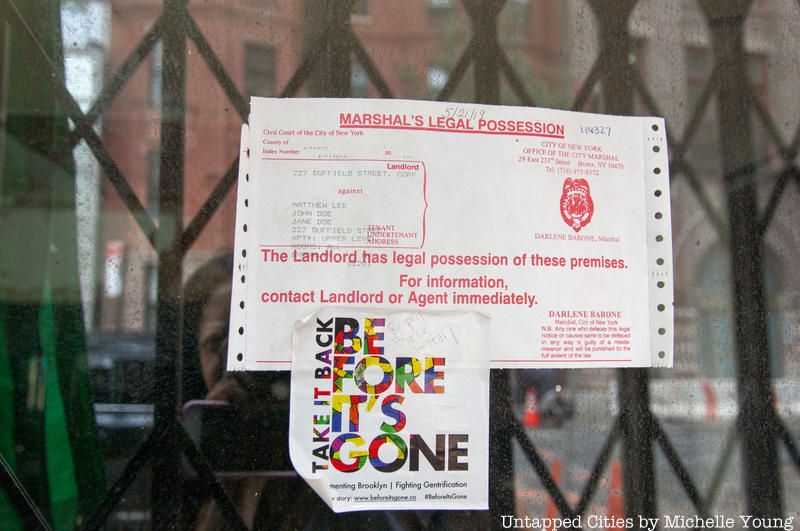For a period of time, 227 Duffield Street was turned into the 227 Abolitionist Place Museum and Heritage Center run by Joy Chatel, the owner of the building who was a key part of the preservation efforts. She passed away in 2014, and in 2016 when we were researching this location for our book Secret Brooklyn: An Unusual Guide, the museum did not appear open any longer and messages through the organization’s website went unanswered. By January 2018, there was a complaint filed with the Department of Buildings that “vacant building doors are open and there is a homeless person living inside.” On March 21, 2019 the Office of the City Marshall placed a notice of the Marshal’s legal possession of the building. Most of the building appears to have been emptied at this time but there is still a framed illustrated image on the front windowsill clearly from the museum days.