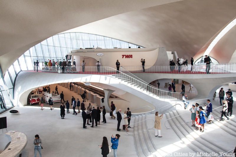 Those negative sentiments did not prevail, enabling it to survive obsolescence and abandonment until its recent nostalgic transformation into the TWA Hotel. In terms of recent critique, Michael Kimmelman, architecture critic for the New York Times, focused on the hotel’s initially rocky soft opening and challenging service, and felt that the hotel is “a theme park for that fantasy version of 1962.”. One of our readers however, who visits the hotel regularly, told us this week that the service was good, and even Kimmelman admitted that Richard Southwick, architect from Beyer Blinder Belle that led the restoration, ” deserves a key to the city. I watched people walk around as if in a trance, snapping selfies, pointing and gazing at the thin, vaulted, soaring, twin-tortoise-shell concrete roof, breathing deeply, to inhale the building’s aura, lingering because, well, just being in that space seems to inspire happiness.”