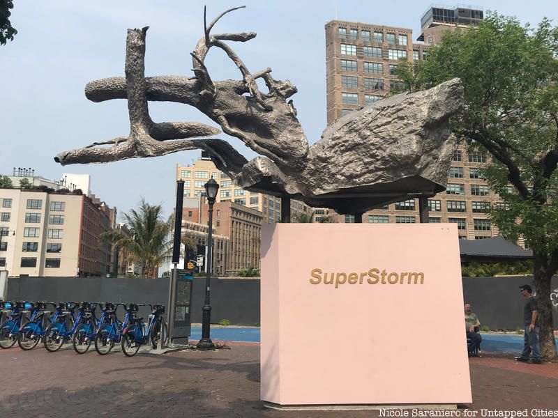 A new sculpture in Duarte Square Park commemorates one of the most intense natural disasters New York City has faced. Inspired by the destruction of Superstorm Sandy, Robert Lobe’s sculpture takes the shape of the storm’s wreckage. Superstorm is made up of hammered metal in the shape of a tree and boulder that were blown apart during the storm. The form was captured by actually taking a cast of the tree and boulder in the forest.