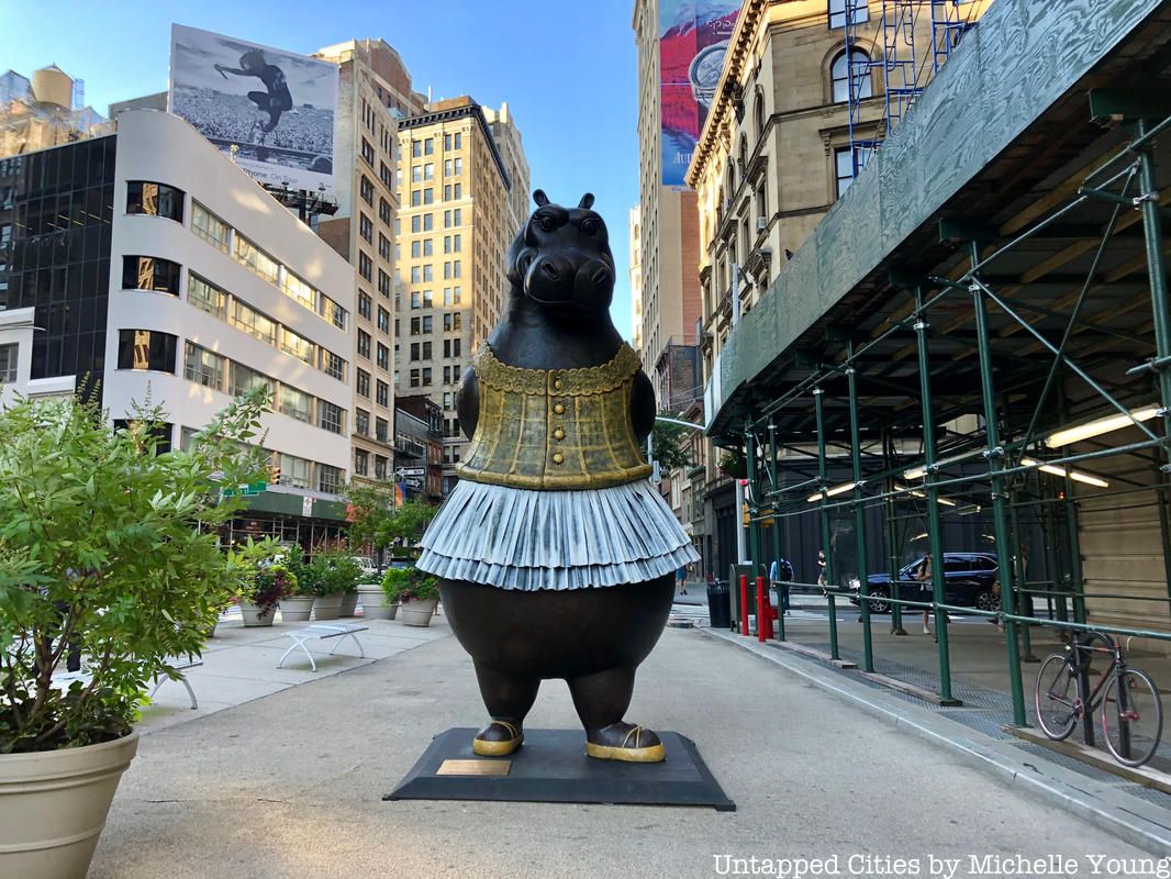 The Hippo Ballerina, a work by Danish artist Bjorn Okholm Skaarup that was previously at Dante Park across from Lincoln Center back in 2017 is now at Flatiron Plaza as part of the NYC DOT Public Art installation program. The 15-foot tall, two and a half ton Hippo is made of bronze with polychrome patina, and takes inspiration Edward Degas’s Little Dancer of Fourteen Years and Walt Disney’s Fantasia. She’s been nicknamed “Henrietta’ by the Flatiron/23rd Street Partnership. The Hippo Ballerina will be on view through November 30th, 2019.