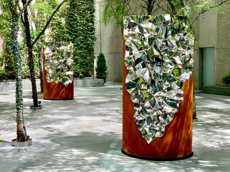 Jonathan Prince, Shatter Series, cor-ten and polished steel, in situ at Christie’s Sculpture Garden 2019, courtesy of Jonathan Prince Studio