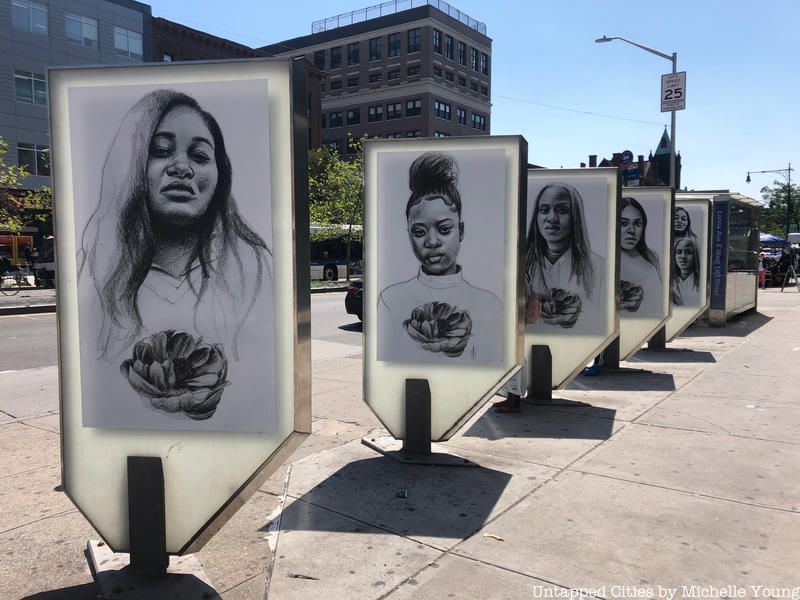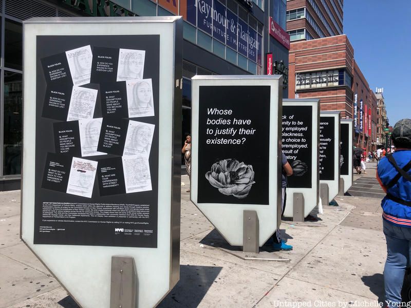 A series of display cases on Lenox Avenue and 125th Street in Harlem contain an exhibition by Brooklyn artist Tatyana Fazlalizadeh, a Black/Iranian visual artist who is the New York City Commission on Human Rights’ Public Artist in Residence. The series, Stop Telling Women to Smile, is a continuation of a movement started by the artist in 2012 that can be found on walls all across the world. Her artist residency here in New York City aims to “present the experiences of anti-black racism and sexual harassment experienced by New Yorkers through public art.”