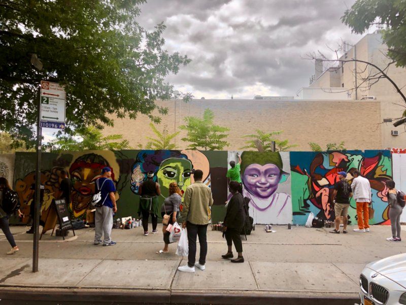 Over the course of September, more than 50 artists painted 1,500 feet of construction barriers along three blocks of 125th Street around a construction site. This makes it one of the largest street art installations of its kind in Manhattan’s history, according to Uptown Grand Central, a nonprofit dedicated to supporting the 125th Street/Metro-North corridor, who is behind the initiative. Artists who were selected to participate included TooFly, Marthalicia, and Shiro, with priority given to artists from the local community.