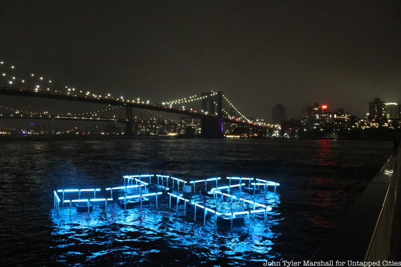 +POOL, the project to create a filtering pool for the East River has been gaining steam, with the city recently putting out a request for proposals for the innovative idea. On October 3rd, the organization will be putting on a unique light installation off Pier 17 at the South Street Seaport in a 50×50 foot outline of the pool. Designed by PLAYLAB INC & Family New York with collaboration from scientists at Columbia University’s Lamont Doherty Earth Observatory (LDEO), the LED lights will change color based on the quality of water analyzed in real time. According to +POOL, “an algorithm was created that will inform the changing of the lights by predicting swimmable water computed based on environmental conditions and data pulled from sondes placed in the river on site.”