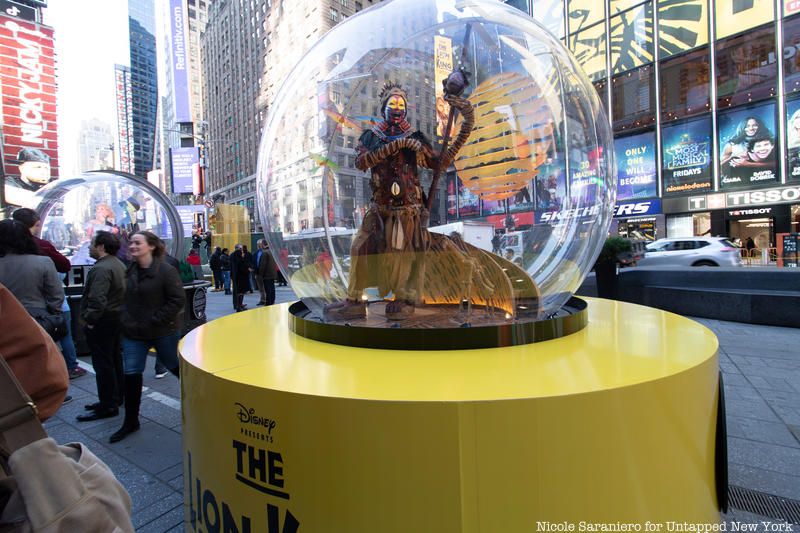 Holiday decorations are starting to pop up around New York City this month. One of the first holiday installations to see are the Times Square Show Globes. Presented by the Times Square Alliance, the Show Globes celebrate the creativity of Broadway designers and the power of live theater with these. The designs were inspired by some of the most-loved musicals on Broadway and invite passersby to admire the imagination and talent that give life to every show. The four Show Globes will be inspired by the designs of Ain’t Too Proud – The Life and Times of The Temptations, Dear Evan Hansen, The Lion King, and Wicked. The Show Globes were designed by members of each show’s production team and inspired by the themes and characters of the show.