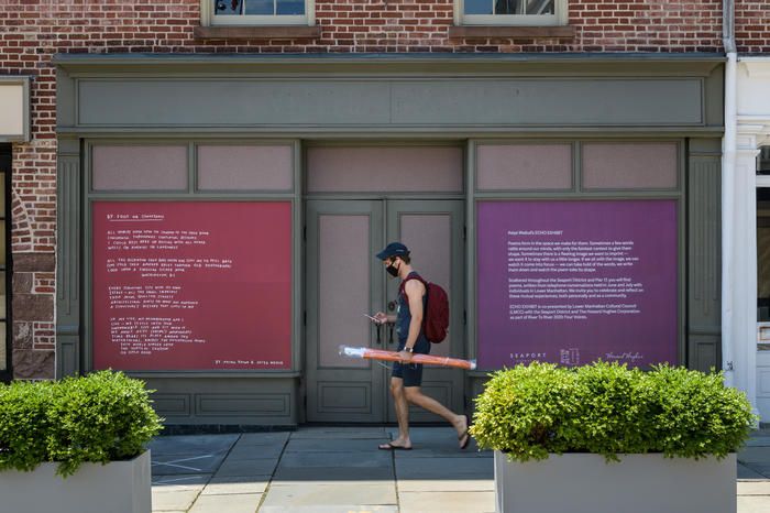 Scattered throughout the Seaport District and Pier 17, you can now find a series of poems written based on telephone conversations held by individuals in Lower Manhattan during the months June and July. The display of the poems was designed by Shannon Finnegan. The poems, which together are named Echo Exhibit, are meant to serve as lasting evidence of the conversation between strangers during the quarantine, capturing the unique qualities and emotions of the situation.