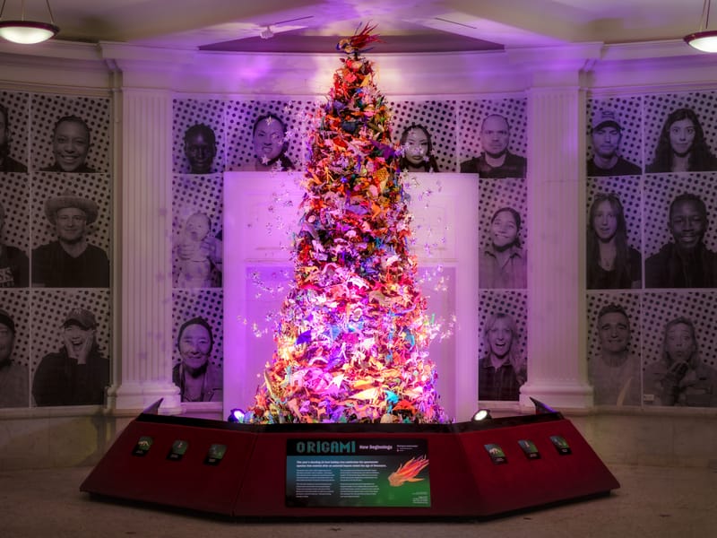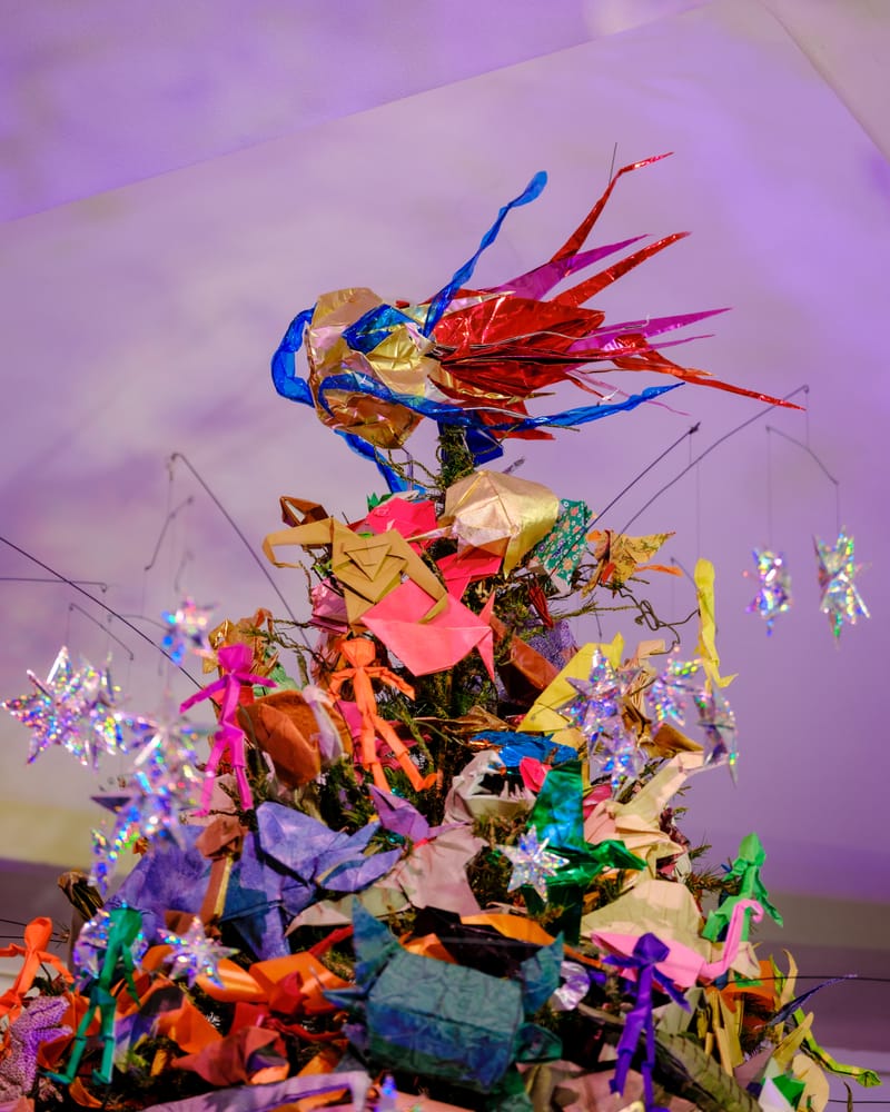 Each of the 1,000 ornaments is hand-folded by local, national, and international origami artists, in partnership with OrigamiUSA. This year's tree was designed by Ros Joyce and Talo Kawasaki.
