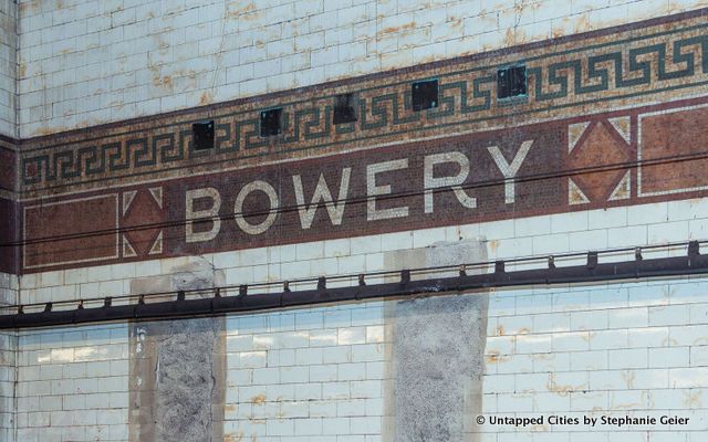 The abandoned Bowery Station Platform was originally designed with four tracks and two island platforms. However today only two tracks at this station continue to be used, after renovations in 2004 removed one of the tracks and another remains inactive. One of the clearest signs that this platform is abandoned is that the space is completely devoid of benches.