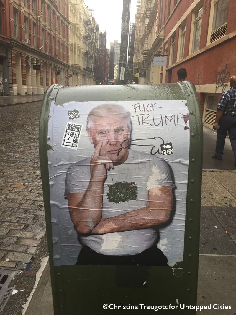 Since the city’s green mailboxes don’t receive a lot of attention, they’ve be repurposed as art canvases for political propaganda. This seems to be collaborative piece, as evidenced by the additional “Fuck Trump” exclamation and floating phallus. This piece was found on Broome Street, a few blocks from West Broadway in Soho.