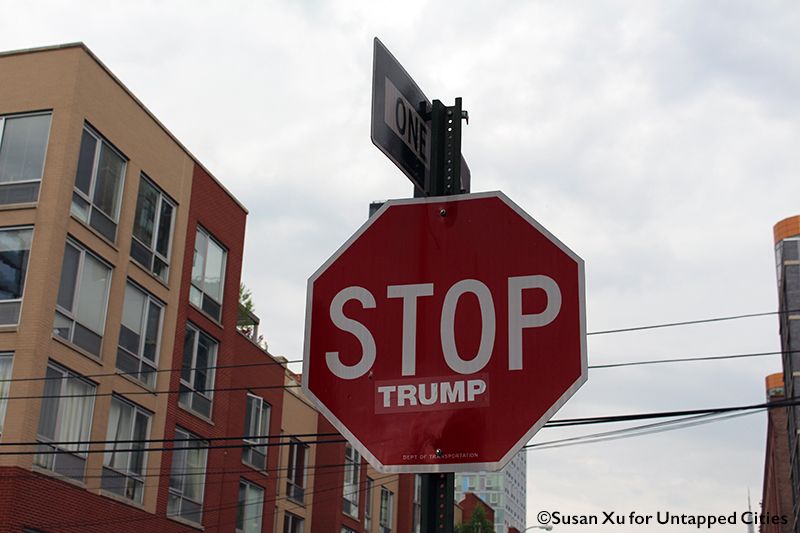 In Long Island City, the marriage of a city fixture with a political bumper sticker results in the ingenious form of propaganda that you really can’t ignore – STOP TRUMP.