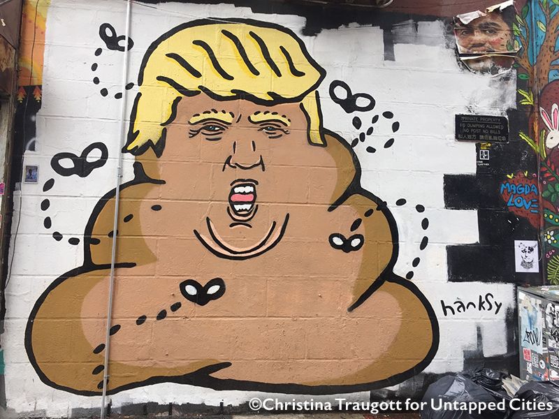 Street artist Hanksy, who has an affinity for “street puns,” painted this mural on Orchard Street at Canal Street on the Lower East Side. His inspiration came from the fact that “Trump kinda rhymes with dump.” The sudden epiphany gave rise to what locals are calling “Donald Dump.”