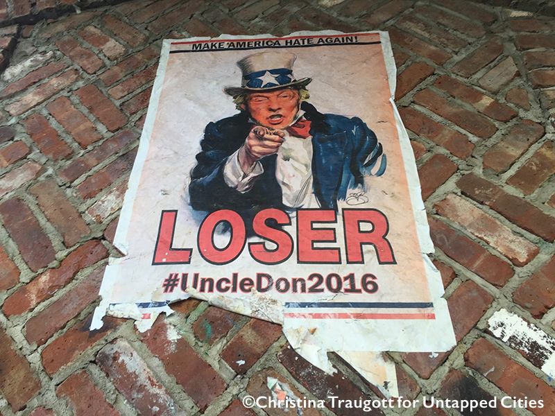 Working under the hashtag #spreadthehate, UncleDon2016 provides access to printable posters and stickers so that people can cover their neighborhoods with similar political posters. This poster, found under scaffolding on Houston Street just west of Bowery, shows Trump as a “LOSER” Uncle Sam in the famous “WE WANT YOU” pose, the U.S. Army recruiting poster.