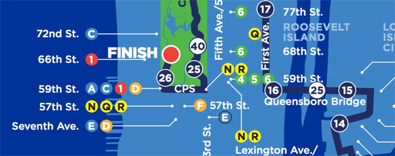The post-finish area is not open to spectators. However, if you’d like to reunite with a runner, head to the Family Reunion section, located on Central Park West between West 60th Street and West 65th Street. It’s open from 12pm to 5pm, and visitors can enter from Broadway at the cross-street that correlates with the first letter of the last name of the participant (see map).