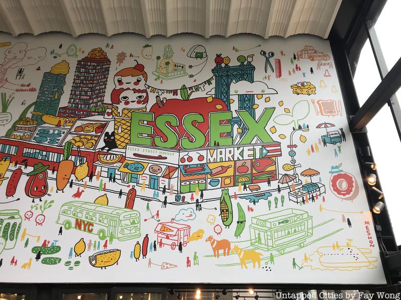 The mural in the Essex Street Market above the demonstration kitchen is by Aaron Meshon, an artist and children’s book author based in Brooklyn.  The work was chosen as part of an open call, with the winner chosen by curators at the Lower East Side Partnership, Community Board 3, Grand Street Settlement, Artist Alliance, Chinese-American Planning Council, and NYCEDC. The Essex Street Market posted on Instagram “We are thrilled with the clever take on our historic corner building and the detailed representations of all our vendors’ offerings.”