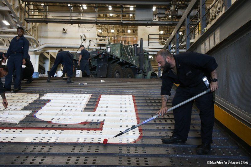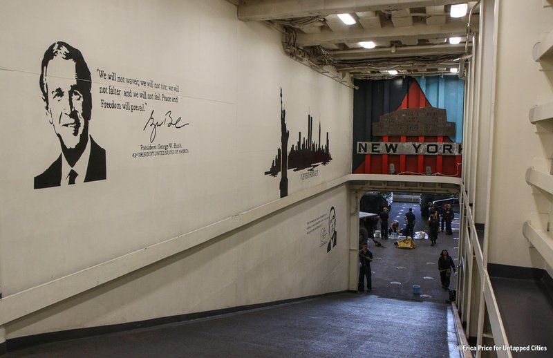 The USS New York is full of art. A lot of is dedicated to 9/11, but also to New York City in general. The Command Control Center has a figure of Batman looming above the Twin Towers. The ramp to the well deck, where the 9/11 plated steel is located, has a Bansky-esque stencil outline of the New York City skyline, Twin Towers included, and the Statue of Liberty, along with the faces of former U.S. Presidents Barack Obama, and George H.W. Bush, with quotes about service and freedom. The “beach” of the well deck was getting the NY Giants logo painted as we walked through.