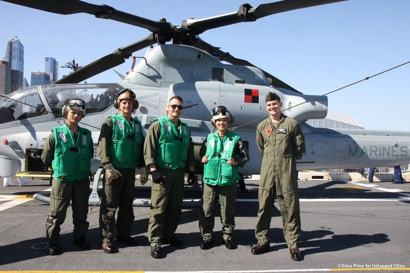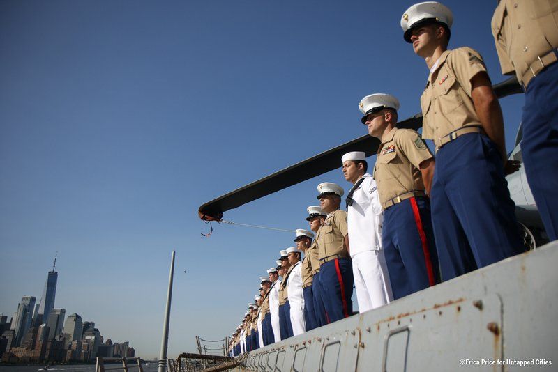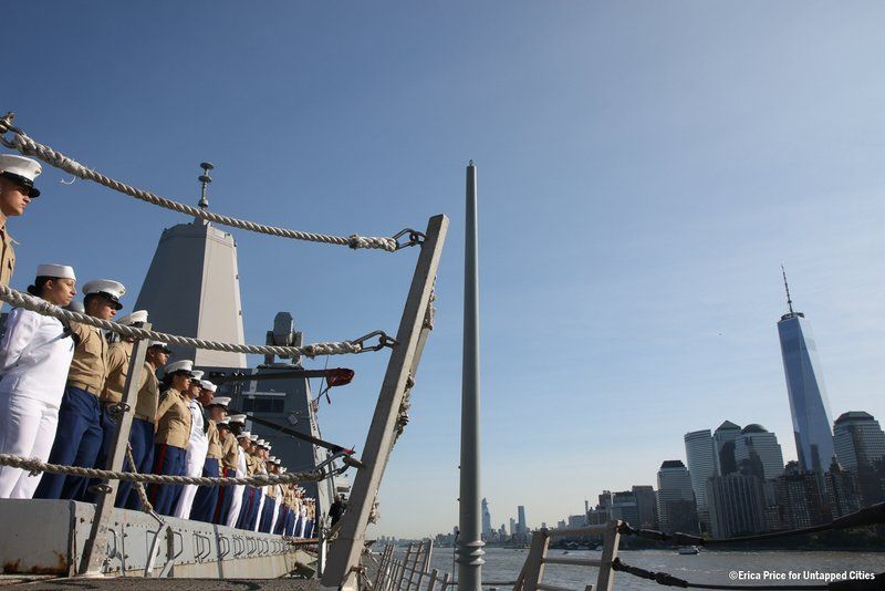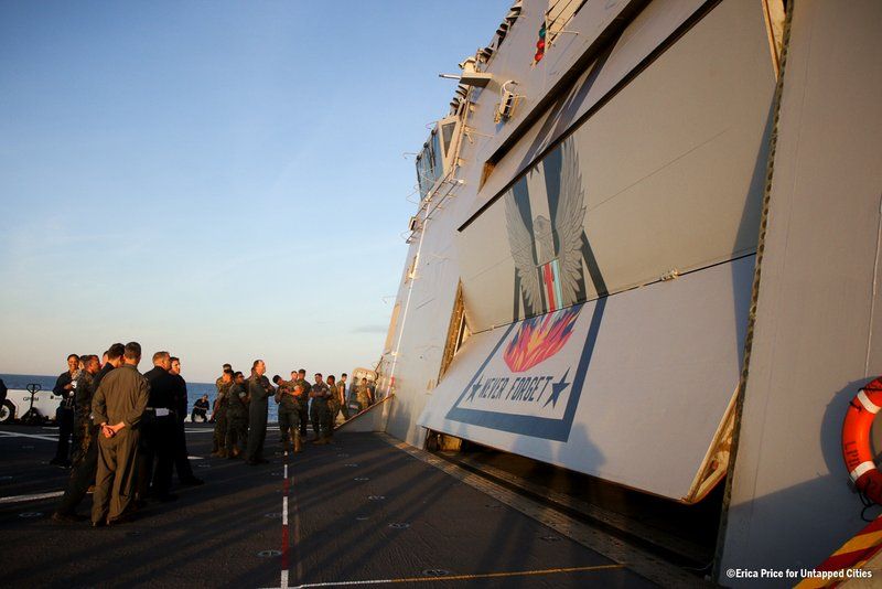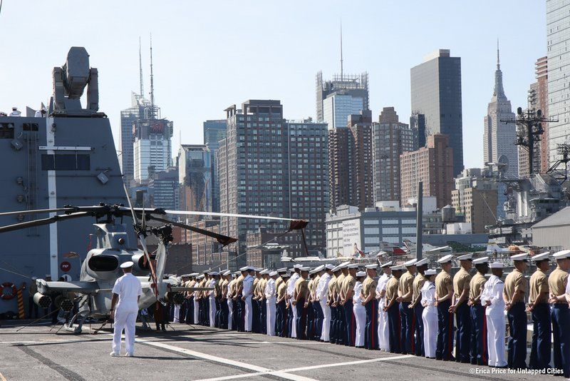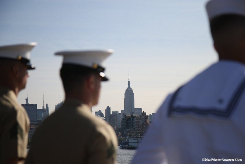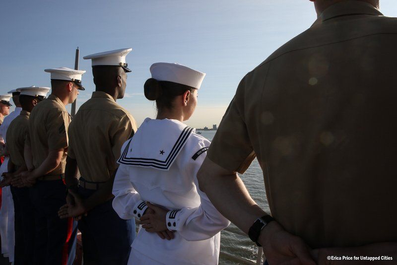 Earlier this week, Untapped Cities had the honor of embarking on the USS New York, the lead ship for the Parade of Ships during Fleet Week 2019, for an overnight stay. We flew in an Osprey helicopter from Manhattan and boarded somewhere in the Atlantic Ocean off the New Jersey coast. We were given a tour of the ship, bunked in an officer’s stateroom, shared meals with the captain and other officers, and witnessed many moving and inspirational events on this ship, which is dedicated to the victims of 9/11. This ship is the living representation of those people [who lost their lives on 9/11],” Command Master Chief, Ben Hodges of the USS New York told us on a tour of the ship, “It’s great to have the opportunity to bring the ship back to New York City.”
