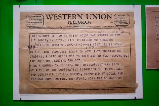 An original Western Union telegram from United States President Eisenhower congratulating those responsible for the opening of Morningside Gardens in Morningside Heights is a real highlight of the exhibition. Eisenhawer deemed Morningside Gardens an “outstanding project” and that it provided “an inspiring example of what can be done by neighbors acting together to bring better living for all.”