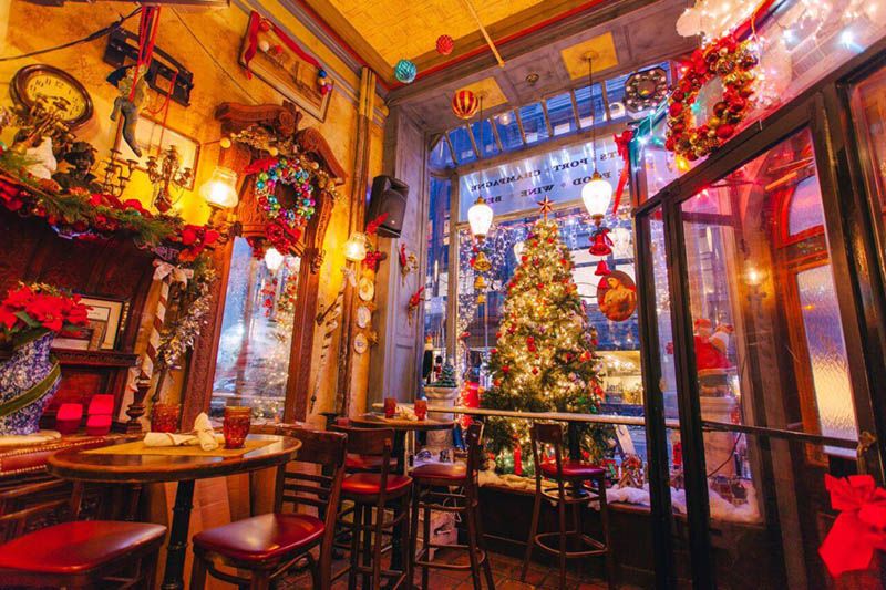 Both outposts normally boast beautiful stained-glass windows, high ceilings, antique lamps, and Victorian-era art, but during the holiday season the spaces are transformed with beautiful wreaths, baubles, trinkets, and all sorts of colorful decorations. Their seasonal cocktails include the Whiskey Citrus Shandy, the Dirty Old Bastard, and the Mezcal Gold Rush among other classics and specialties. Addresses: 13 East 17th Street and 249 West 49th Street