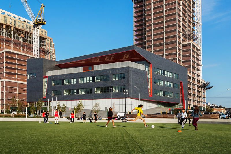 As Hunters Point South in Queens continues to develop and grow, there arises a need for infrastructure, like schools, to support that growth. FXCollaborative, along with designing the master plan for the area, designed a 145,000-square-foot school for the area which will accomodate 1,071 students. The building will house three different schools that will have their own learning spaces and share common areas like dining spaces, an auditorium, and an outdoor terrace that offers students views of Manhattan across the East River. The school sits alongside the newly opened Hunter Point South Park design by landscape architecture firm SWA/Balsley, which features a turf field for students to take advantage of.