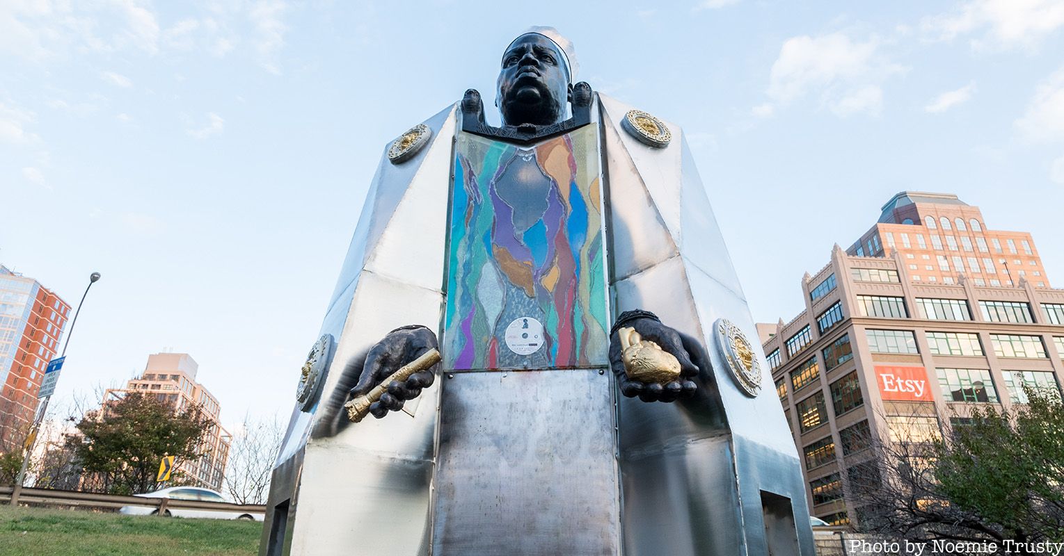 On the northeast corner of Prospect Street and Washington Street, a sculpture of rapper Biggie Smalls stands watching over the Brooklyn Bridge. Made of stainless steel, bronze, and other materials, the artwork includes pieces that tell the story of B.I.G.’s short but impactful musical career. An audio system, which pays homage to the boomboxes of hip hop’s early days, plays a selection of Notorious B.I.G hits.