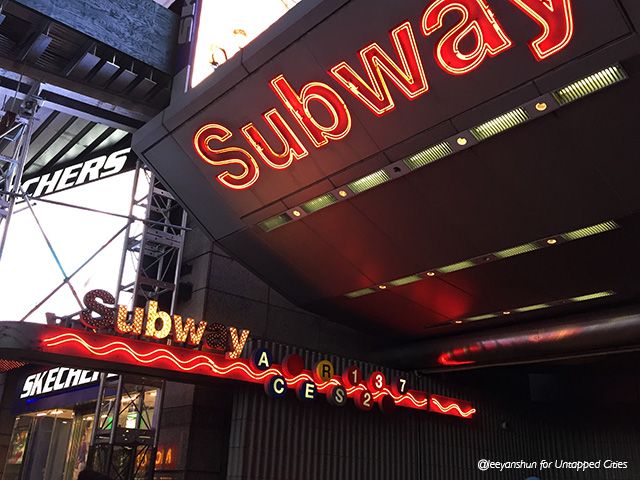 MTA subway stations are usually announced by signature green railings with the letter “M” printed on white and green light bulbs. It might be considered inappropriate for the city subway to be too glam-ed up, but the MTA is definitely not shy about their flashy subway entrances. One of the more extreme ones on 42nd Street features wavy awnings with lit sides and blinking letters on the word “Subway.” This renovation was part of the rehabilitation of 42nd Street in the late 1990s and early 2000s, which also included moving the Empire Theatre 168 feet down the street.