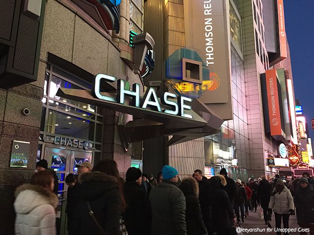 Even the bank needs to stake its claim in Times Square. Chase Bank’s 500 other branches in New York are mostly utilitarian, with rather small logos etched onto windows only to delineate different kinds of branches. Though glittering signage are not to be seen at the JPMorgan Chase & Co. bank branch at Times Square, it sets itself apart by repeatedly using its logo on every window. At the main entrance, the lantern-like octagonal logo not only lights up, it even rotates!
